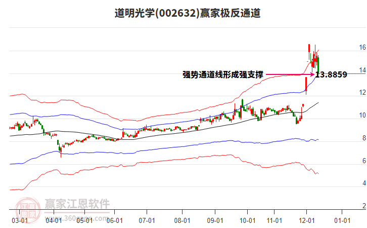 道明光學(002632)根據(jù)贏家江恩極反通道趨勢工具展示,上方壓力位14.428,下方支撐位12.004。道明光學(002632)處于贏家江恩多頭主線形態(tài),12月11日發(fā)出江恩筑頂信號后,經(jīng)過25日,