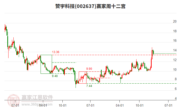 當天贊宇科技002637最高價13.55挑戰(zhàn)了贏家極反通道工具上方紅色外軌線,受到上方紅色外軌線強力壓制,最終收盤停留在在上方紅色外軌線與藍色外軌線上方的超強通道區(qū)域。贊宇科技002637近10個交易