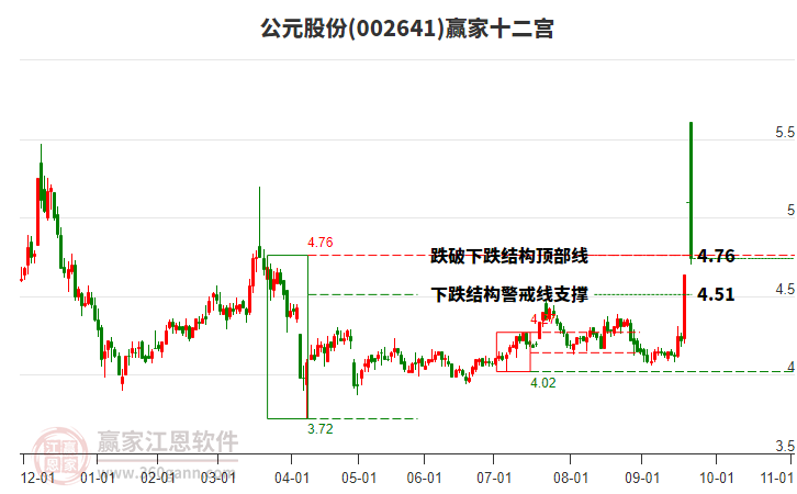 002641公元股份處于贏家江恩多頭中期回調(diào)形態(tài),12月17日發(fā)出江恩筑頂信號后,經(jīng)過13日,今日再次發(fā)出江恩底分型并發(fā)出江恩筑底信號,中期多頭反彈趨勢延續(xù),但長期處于回調(diào)中。002641公元股份根據(jù)