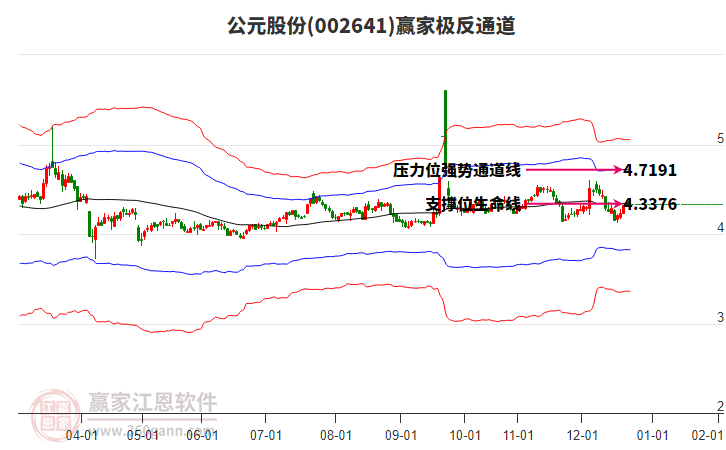 依據(jù)贏家江恩系統(tǒng)趨勢工具極反通道分析判斷公元股份002641運行在生命線以下弱勢區(qū)域,根據(jù)規(guī)則該股短線輕倉參與,股價跌至弱勢外軌線后波段再結(jié)合其它工具信號建倉。應(yīng)用口訣是:生命線上強勢走,生命線下難抬頭;紅黃兩條外軌線,壓力支撐顯勢頭。