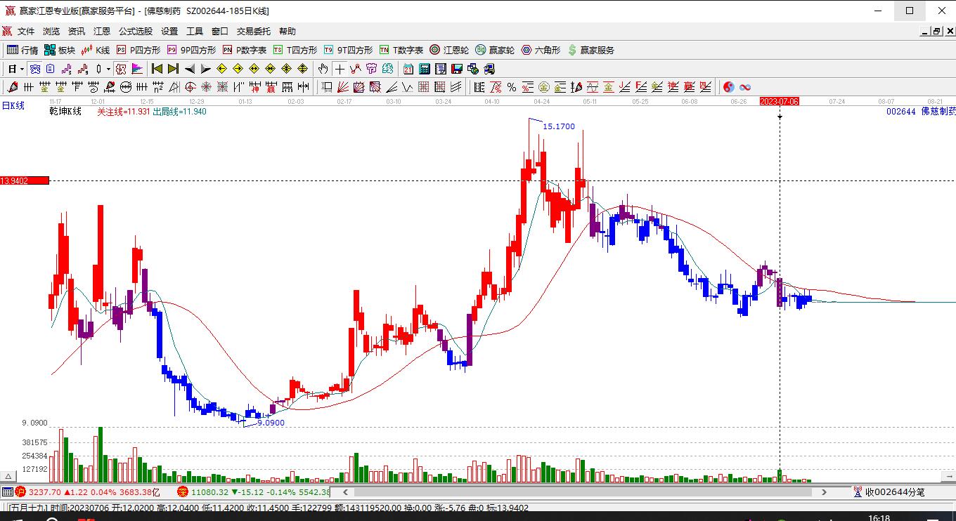 002644佛慈制藥處于贏家江恩多頭次主線形態(tài),從1月26日形成頂分型后持續(xù)下跌,重心下移,今日跌破前低形成短期初次筑頂信號(hào),短期多頭趨勢已被破壞,中長期目前都處于回調(diào)中。002644佛慈制藥根據(jù)贏家