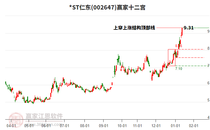 *ST仁東(002647)目前漲停,走出獨立行情。*ST仁東(002647)截止目前突破江恩價格百分比工具壓力位10.43元,根據(jù)贏家江恩江恩價格百分比工具展示,上方第一壓力位10.95,第二壓力位1