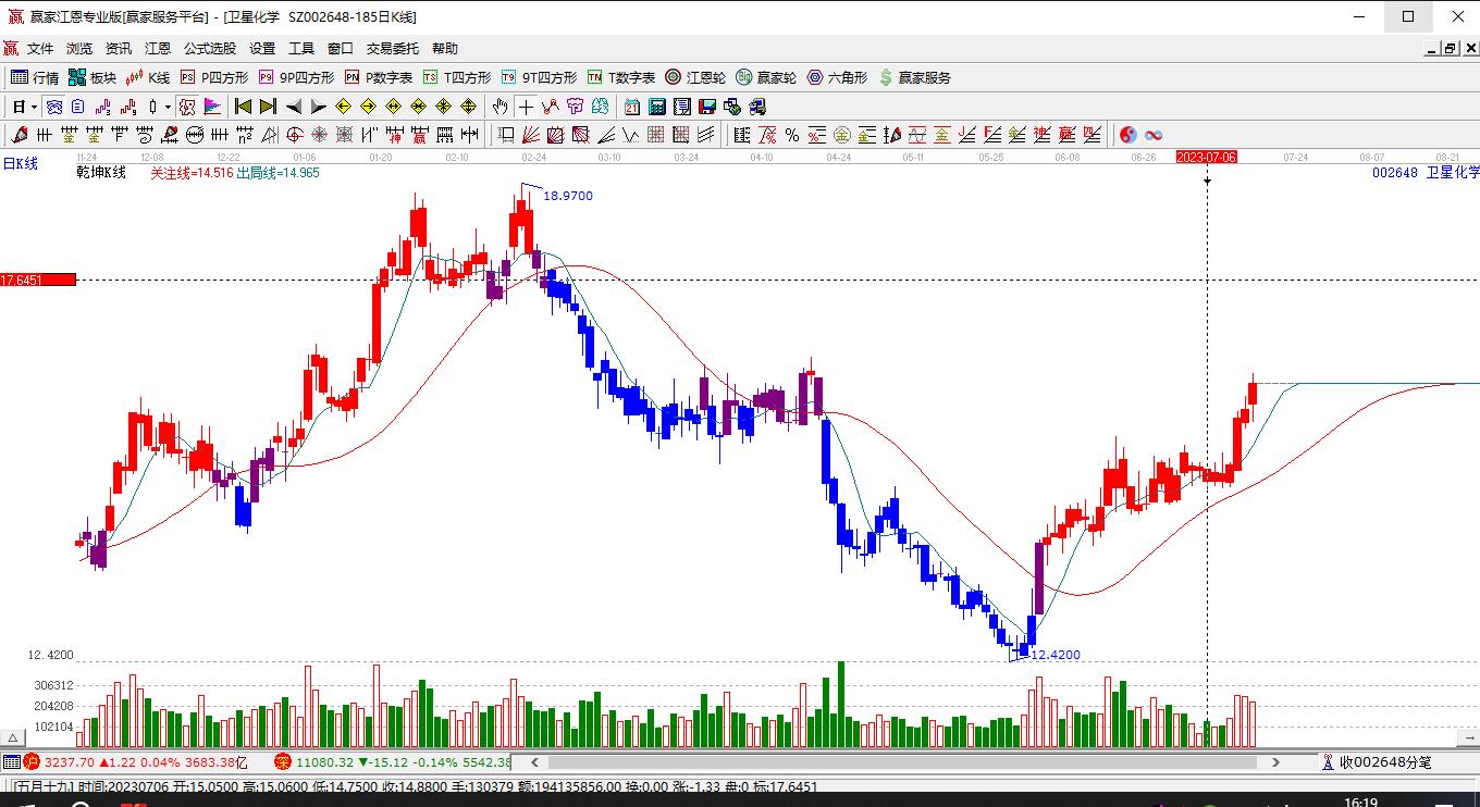 衛(wèi)星化學(xué)根據(jù)贏家江恩極反通道趨勢(shì)工具展示,上方壓力位17.2757,下方支撐位15.4396。衛(wèi)星化學(xué)處于贏家江恩空頭中期反彈形態(tài),從12月16日形成底分型后持續(xù)上攻,今日突破前高形成初次江恩筑底信號(hào)