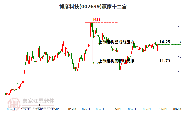 依據贏家江恩系統趨勢工具極反通道分析判斷博彥科技002649運行在生命線以上強勢區(qū)域,根據規(guī)則該股可短線、波段結合操作;結合物極必反的原理通過分鐘圖做盤中差價,應用口訣是:生命線上強勢走,生命線下難抬頭;紅黃兩條外軌線,壓力支撐顯勢頭。