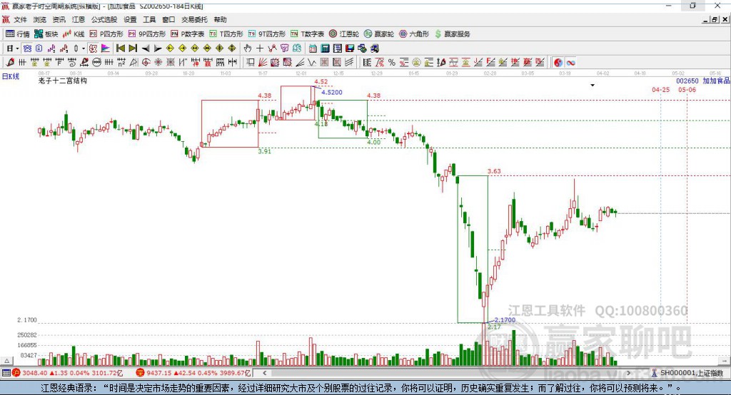 依據(jù)贏家江恩系統(tǒng)趨勢工具極反通道分析判斷ST加加002650運(yùn)行在生命線以上強(qiáng)勢區(qū)域,根據(jù)規(guī)則該股可短線、波段結(jié)合操作;結(jié)合物極必反的原理通過分鐘圖做盤中差價(jià),應(yīng)用口訣是:生命線上強(qiáng)勢走,生命線下難抬頭;紅黃兩條外軌線,壓力支撐顯勢頭。