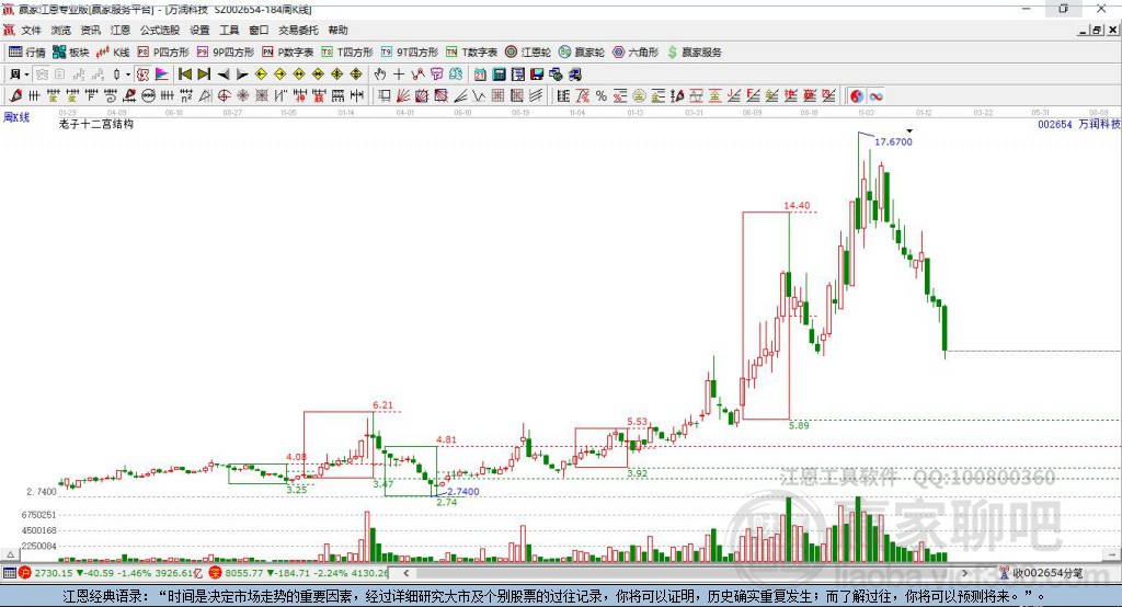002654萬潤科技處于贏家江恩空頭主線形態(tài),從1月22日形成頂分型后持續(xù)下跌,今日形成短期初次筑頂信號,短期多頭趨勢已被破壞,中長線均在空頭下跌趨勢中。002654萬潤科技根據(jù)贏家江恩極反通道趨勢工
