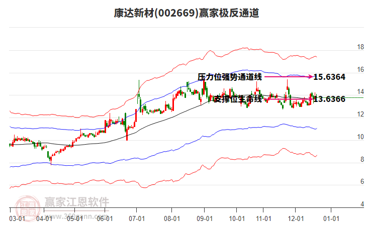 依據(jù)贏家江恩系統(tǒng)趨勢工具極反通道分析判斷康達(dá)新材002669運(yùn)行在生命線以下弱勢區(qū)域,根據(jù)規(guī)則該股短線輕倉參與,股價(jià)跌至弱勢外軌線后波段再結(jié)合其它工具信號(hào)建倉。應(yīng)用口訣是:生命線上強(qiáng)勢走,生命線下難抬頭;紅黃兩條外軌線,壓力支撐顯勢頭。