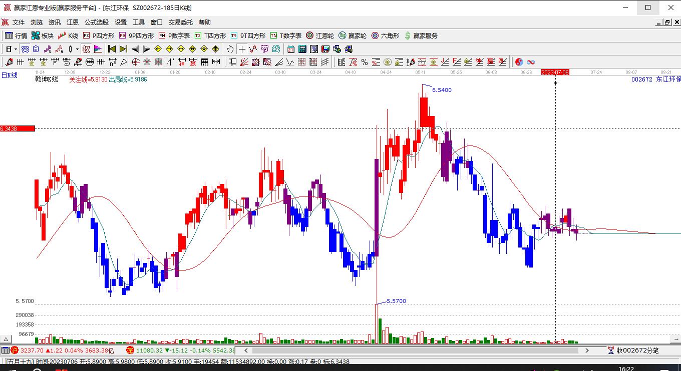 今天東江環(huán)保002672挑戰(zhàn)藍色外軌線 以上影小陽線收盤