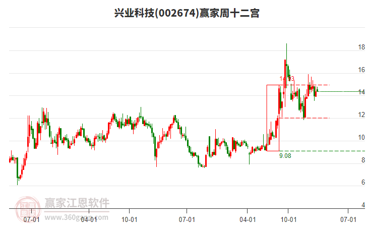 002674興業(yè)科技處于贏家江恩多頭主線形態(tài),從12月12日形成底分型后持續(xù)上攻,今日突破前高形成初次江恩筑底信號(hào),中期多頭趨勢(shì)延續(xù),但長(zhǎng)期處于回調(diào)中。002674興業(yè)科技根據(jù)贏家江恩極反通道趨勢(shì)工具