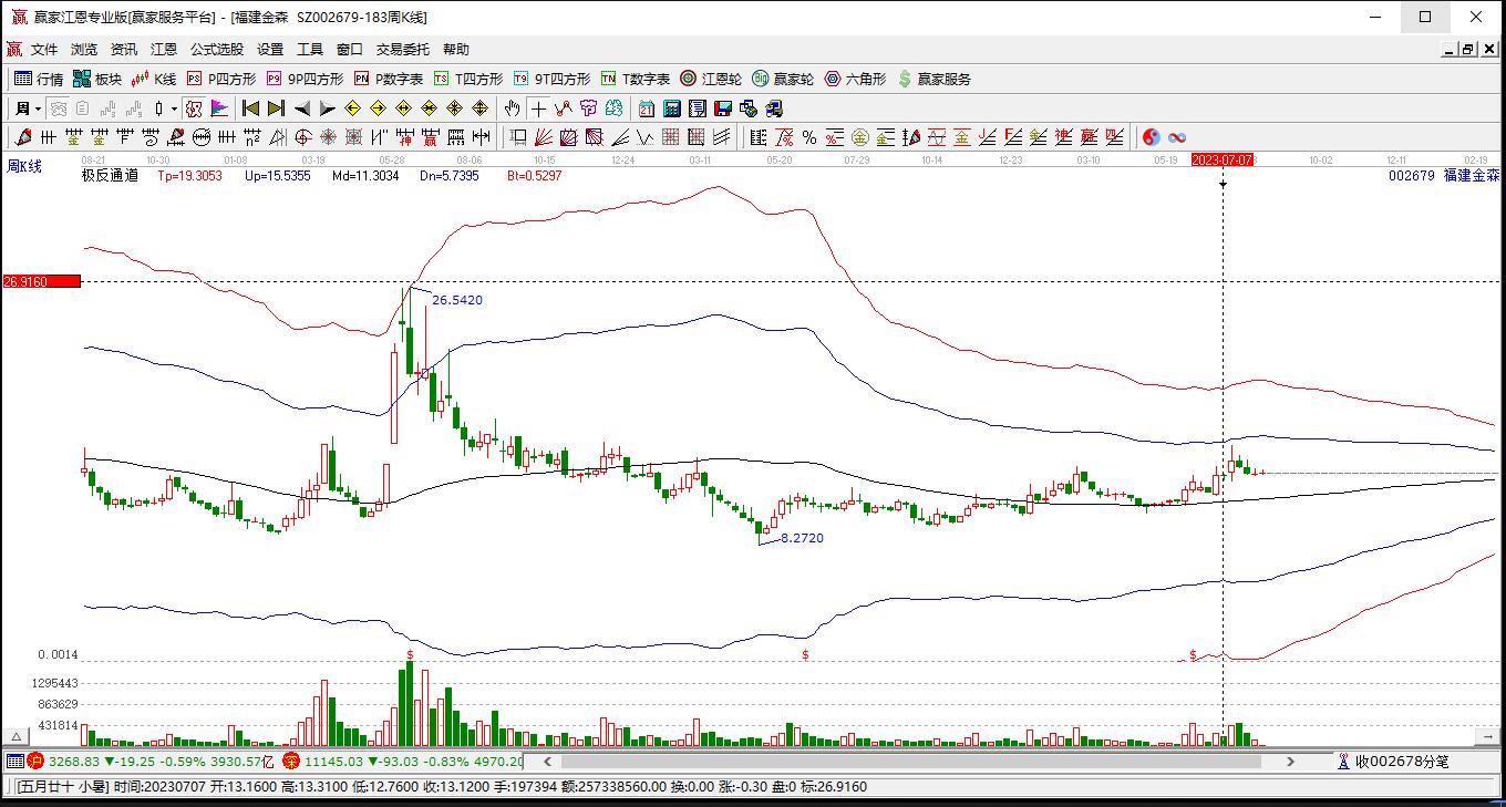 福建金森處于贏家江恩多頭次主線形態(tài),從1月26日形成頂分型后持續(xù)下跌,重心下移,今日跌破前低形成短期初次筑頂信號,短期多頭趨勢已被破壞,中長期目前都處于回調(diào)中。福建金森根據(jù)贏家江恩極反通道趨勢工具展示