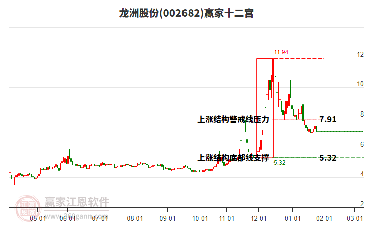 2月13日股價處在2025年12月15日形成的上漲結(jié)構底部線與警戒線之間,今日股價微漲0.43%,目前處于底部線上方。依據(jù)贏家十二宮多空能量守恒規(guī)則,上漲結(jié)構底部線位置是多空能量轉(zhuǎn)換的一個關鍵位置。如底部線5.32支撐不破,由多方能量主導上攻,在警戒線7.91尋找多空能量平衡。如跌破底部線,空方動能占據(jù)主導,打開新的下跌空間。