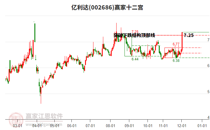 億利達(dá)(002686)處于贏家江恩多頭中期回調(diào)形態(tài),今日重心上移,短期持續(xù)上漲,從12月3日形成中期頂分型后中期重心持續(xù)下移,今日跌破前低形成初次筑頂信號(hào),長(zhǎng)期處于多頭上漲趨勢(shì)。億利達(dá)(002686)