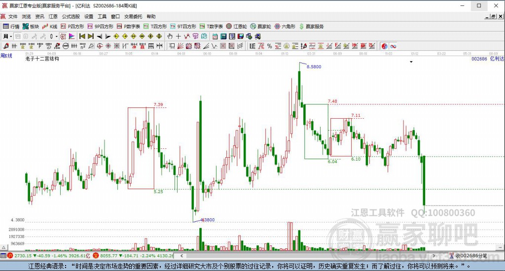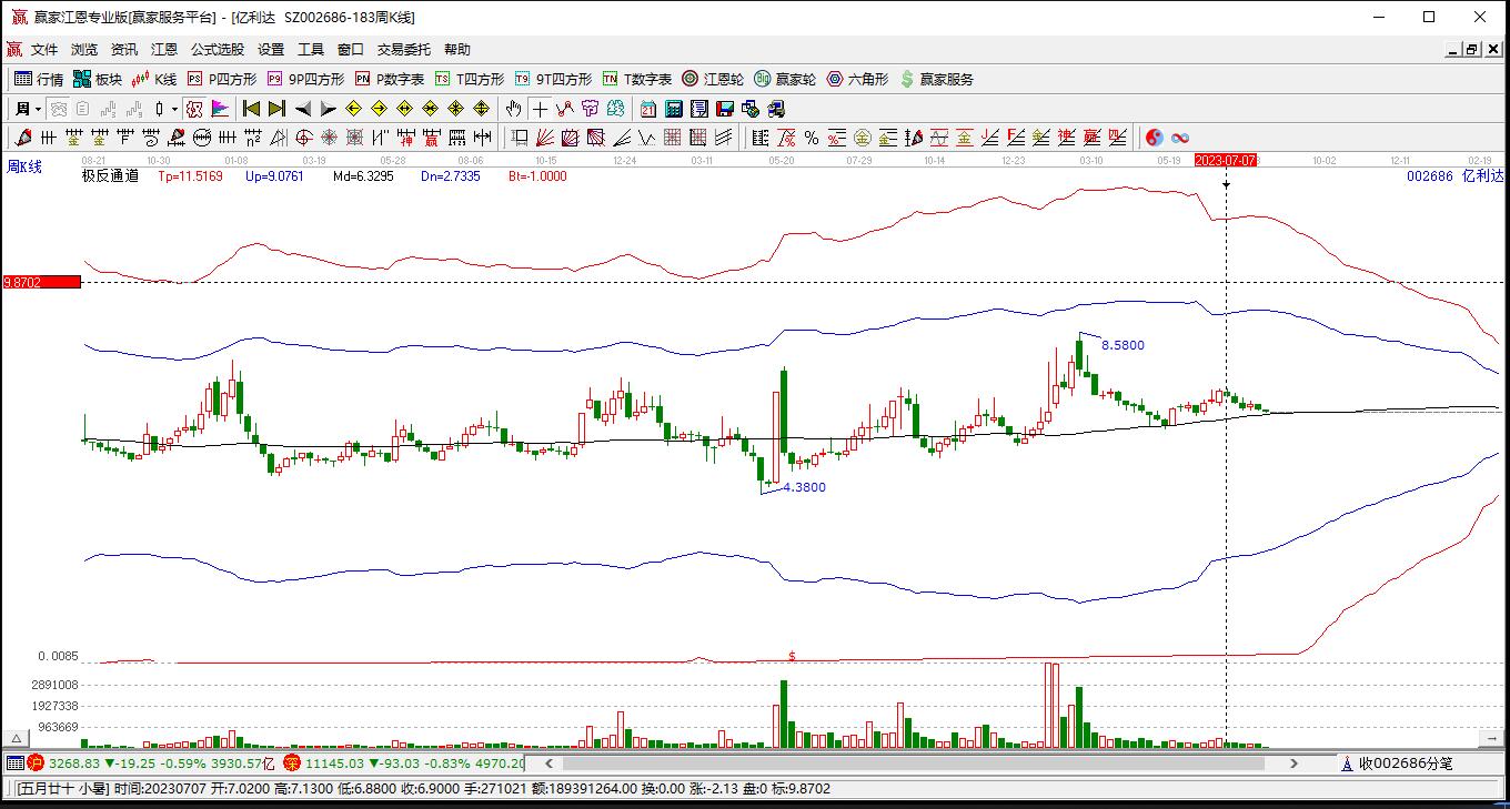 依據贏家江恩極反通道趨勢工具展示,本周股價處于生命線上強勢通道,本周收盤價6.9,自近期通道內低點6.16上漲至本周,到達生命線6.3854點上方,短期關注此線支撐,如支撐不破,保持在強勢通道內,波段繼續(xù)看多,有望挑戰(zhàn)藍色上軌線。若跌破生命線6.3854,進入弱勢通道,調整周期繼續(xù)延長。