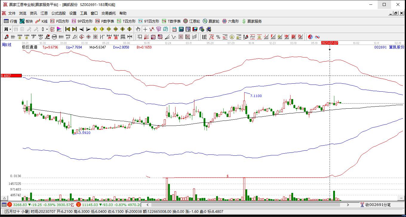 002691冀凱股份根據(jù)贏家江恩極反通道趨勢工具展示,上方壓力位8.6996,下方支撐位6.7726。002691冀凱股份處于贏家江恩多頭中期回調(diào)形態(tài),從1月26日形成頂分型后持續(xù)下跌,重心下移,今日
