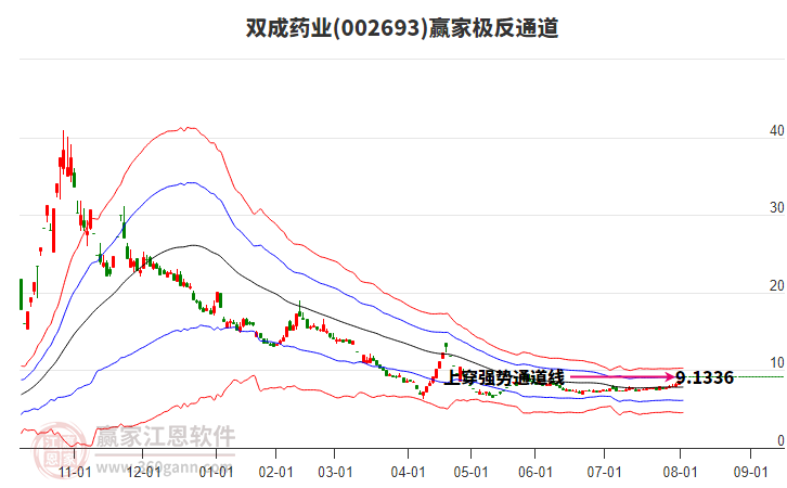 *ST雙成目前漲停,走出獨立行情。*ST雙成截止目前突破極反通道強勢通道線,根據(jù)贏家江恩極反通道趨勢工具展示,上方壓力位9.1638,下方支撐位8.305。*ST雙成今日跳空高開,截止目前K線漲停,上