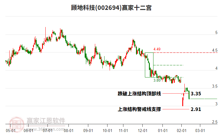 002694顧地科技根據(jù)贏家江恩極反通道趨勢工具展示,上方壓力位4.931,下方支撐位4.3672。002694顧地科技處于贏家江恩多頭主線形態(tài),今日重心下移,形成了頂分型,長期發(fā)出江恩筑底信號,屬長