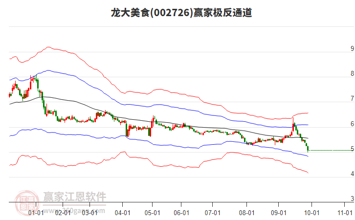 依據(jù)贏家江恩系統(tǒng)趨勢工具極反通道分析判斷龍大美食002726運行在生命線以下弱勢區(qū)域,根據(jù)規(guī)則該股短線輕倉參與,股價跌至弱勢外軌線后波段再結(jié)合其它工具信號建倉。應用口訣是:生命線上強勢走,生命線下難抬頭;紅黃兩條外軌線,壓力支撐顯勢頭。