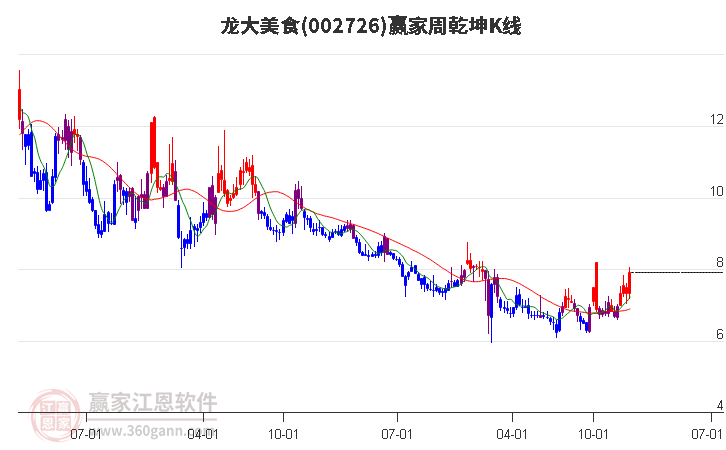 龍大美食(002726)處于贏家江恩空頭主線形態(tài),從11月14日形成頂分型后持續(xù)下跌,今日形成短期初次筑頂信號(hào),短期多頭趨勢(shì)已被破壞,中長(zhǎng)線均在空頭下跌趨勢(shì)中。龍大美食(002726)根據(jù)贏家江恩極反