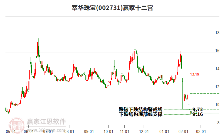 2月13日股價下穿前期2024年12月30日形成的下跌結構警戒線9.72,本輪下跌自近期高點1月28日,持續(xù)11日下跌至今日9.23,跌幅75.51%。依據贏家十二宮多空能量守恒規(guī)則,下跌結構警戒線是多空能量平衡點,突破或跌破往往意味著平衡打破。若股價再次收復站穩(wěn)警戒線位置,多方能量有望再次主導進行上攻,將在頂部線10.29尋找多空能量平衡位。如股價不能收復該警戒線9.72,則股價將會下探至底部線再次尋找底部多空能量平衡位。