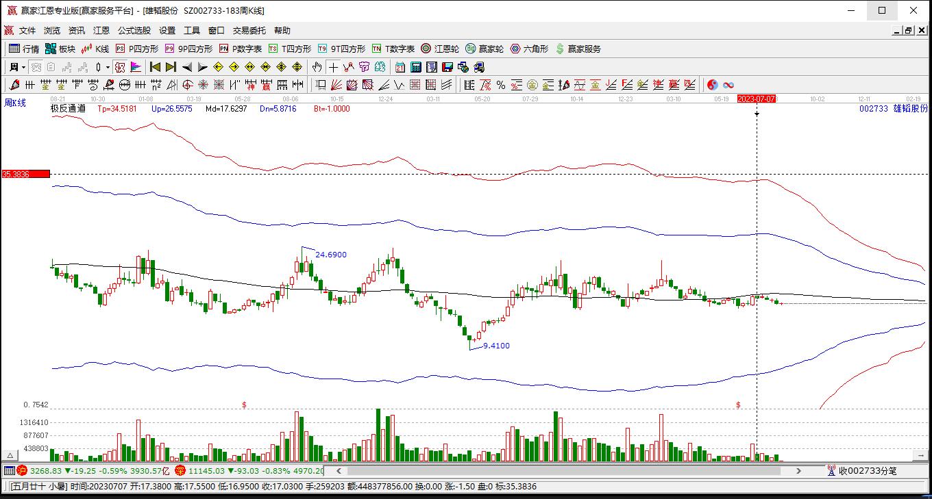 依據(jù)贏家江恩極反通道趨勢工具展示,本周股價處于生命線上強(qiáng)勢通道,本周收盤價19.69,自近期通道內(nèi)高點(diǎn)22.0持續(xù)下跌至本周,到達(dá)生命線18.5027點(diǎn)上方,短期關(guān)注此線支撐,如支撐不破,保持在強(qiáng)勢通道內(nèi),波段繼續(xù)看多,有望再次挑戰(zhàn)藍(lán)色上軌線。若跌破生命線18.5027,進(jìn)入弱勢通道,打開下跌空間。