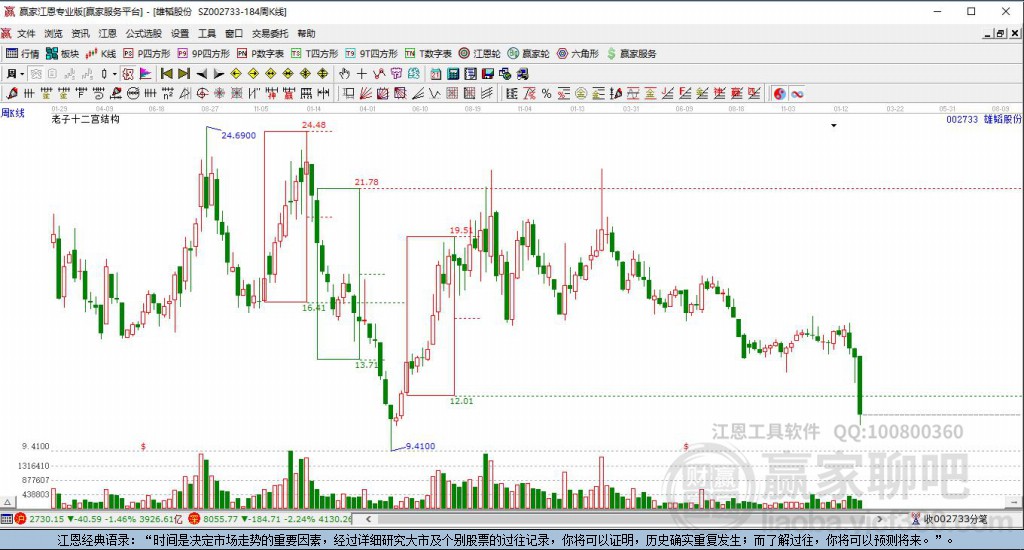002733雄韜股份處于贏家江恩多頭中期回調(diào)形態(tài),12月26日發(fā)出江恩筑底信號后,經(jīng)過45日,今日形成短期筑頂信號,短期多頭趨勢已被破壞,中長線均在空頭下跌趨勢中。002733雄韜股份根據(jù)贏家江恩極反