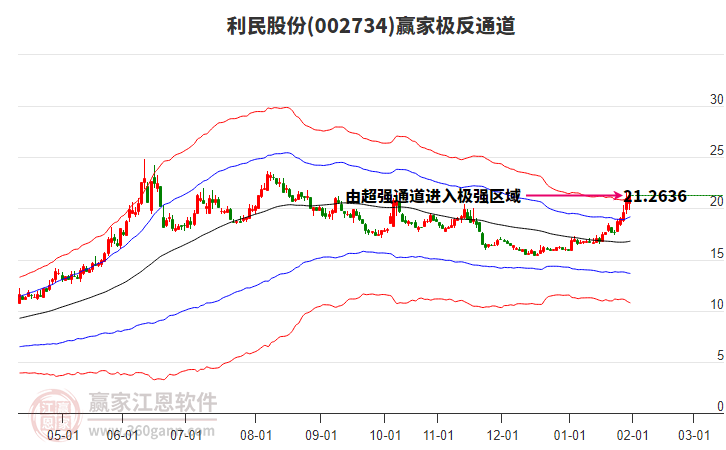 1月29日002734利民股份最高價21.56挑戰(zhàn)了贏家極反通道工具上方紅色外軌線,受到上方紅色外軌線強(qiáng)力壓制,最終收盤停留在在上方紅色外軌線與藍(lán)色外軌線上方的超強(qiáng)通道區(qū)域。002734利民股份近10