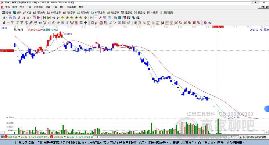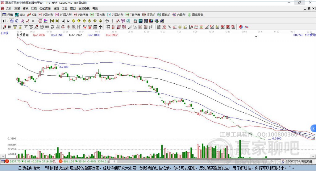 依據(jù)贏家江恩系統(tǒng)趨勢(shì)工具極反通道分析判斷*ST愛(ài)迪002740運(yùn)行在生命線(xiàn)以下弱勢(shì)區(qū)域,根據(jù)規(guī)則該股短線(xiàn)輕倉(cāng)參與,股價(jià)跌至弱勢(shì)外軌線(xiàn)后波段再結(jié)合其它工具信號(hào)建倉(cāng)。應(yīng)用口訣是:生命線(xiàn)上強(qiáng)勢(shì)走,生命線(xiàn)下難抬頭;紅黃兩條外軌線(xiàn),壓力支撐顯勢(shì)頭。