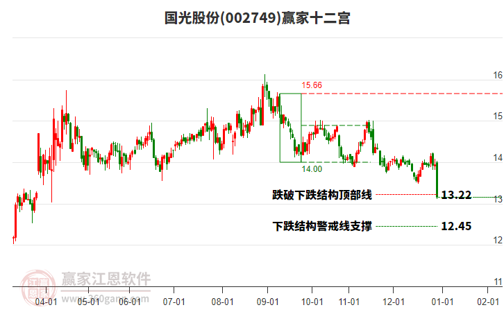 002749國(guó)光股份處于贏家江恩空頭主線形態(tài),從12月8日形成頂分型后持續(xù)下跌,今日形成短期初次筑頂信號(hào),短期多頭趨勢(shì)已被破壞,中長(zhǎng)線均在空頭下跌趨勢(shì)中。002749國(guó)光股份根據(jù)贏家江恩極反通道趨勢(shì)工