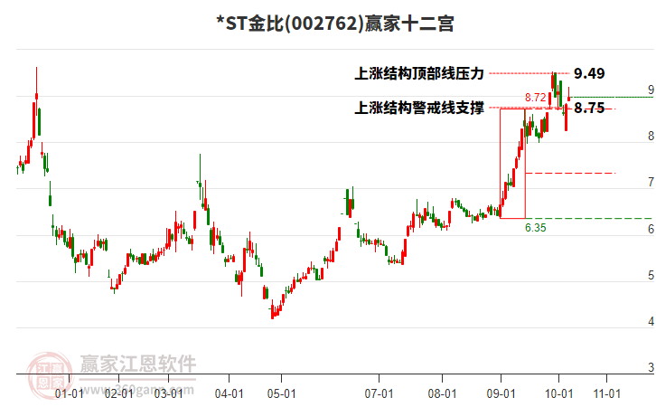 *ST金比處于贏家江恩空頭主線形態(tài),今日雖重心上移,但短期空頭趨勢未改變,8月25日發(fā)出中期江恩筑底信號(hào)后,經(jīng)過162日,今日形成中期筑頂信號(hào),注意風(fēng)險(xiǎn)規(guī)避。*ST金比根據(jù)贏家江恩極反通道趨勢工具展示