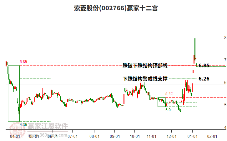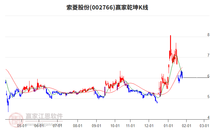 依據(jù)贏家江恩系統(tǒng)趨勢工具極反通道分析判斷索菱股份002766運行在生命線以上強勢區(qū)域,根據(jù)規(guī)則該股可短線、波段結合操作;結合物極必反的原理通過分鐘圖做盤中差價,應用口訣是:生命線上強勢走,生命線下難抬頭;紅黃兩條外軌線,壓力支撐顯勢頭。