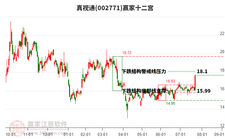 002771真視通根據(jù)贏家江恩極反通道趨勢工具展示,上方壓力位16.2019,下方支撐位13.7765。002771真視通處于贏家江恩空頭主線形態(tài),今日重心下移,形成短期筑頂信號,6月13日發(fā)出中期江
