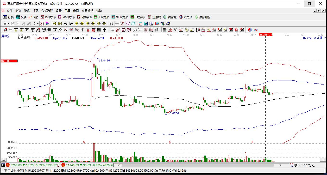 眾興菌業(yè)目前大幅上漲8.37%,走出獨(dú)立行情。眾興菌業(yè)截止目前突破極反通道強(qiáng)勢通道線,根據(jù)贏家江恩極反通道趨勢工具展示,上方壓力位21.0236,下方支撐位17.983。眾興菌業(yè)今日低開,截止目前大幅
