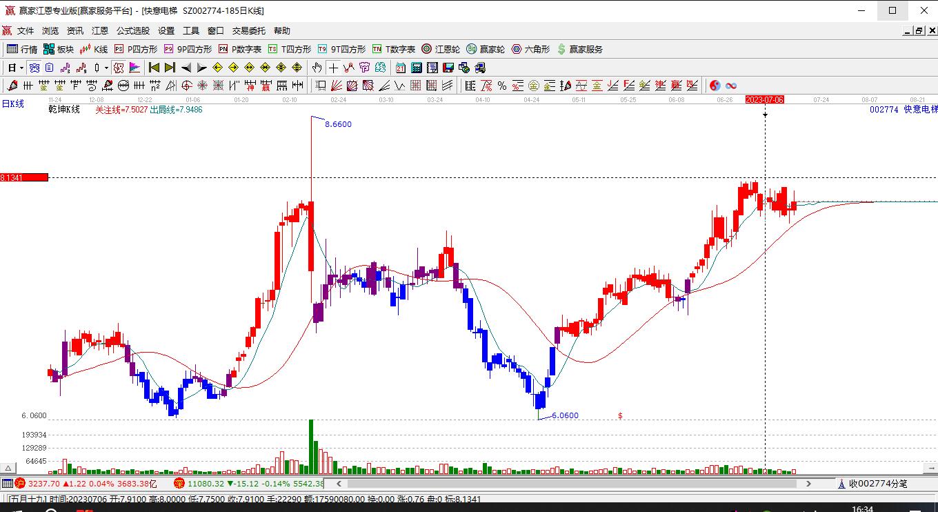 快意電梯(002774)處于贏家江恩多頭次主線形態(tài),1月5日發(fā)出江恩筑底信號后,經(jīng)過22日,今日形成短期筑頂信號,短期多頭趨勢已被破壞,中長期多頭趨勢依舊保持。快意電梯目前K線為光頭小陰線,且當(dāng)前股價(jià)