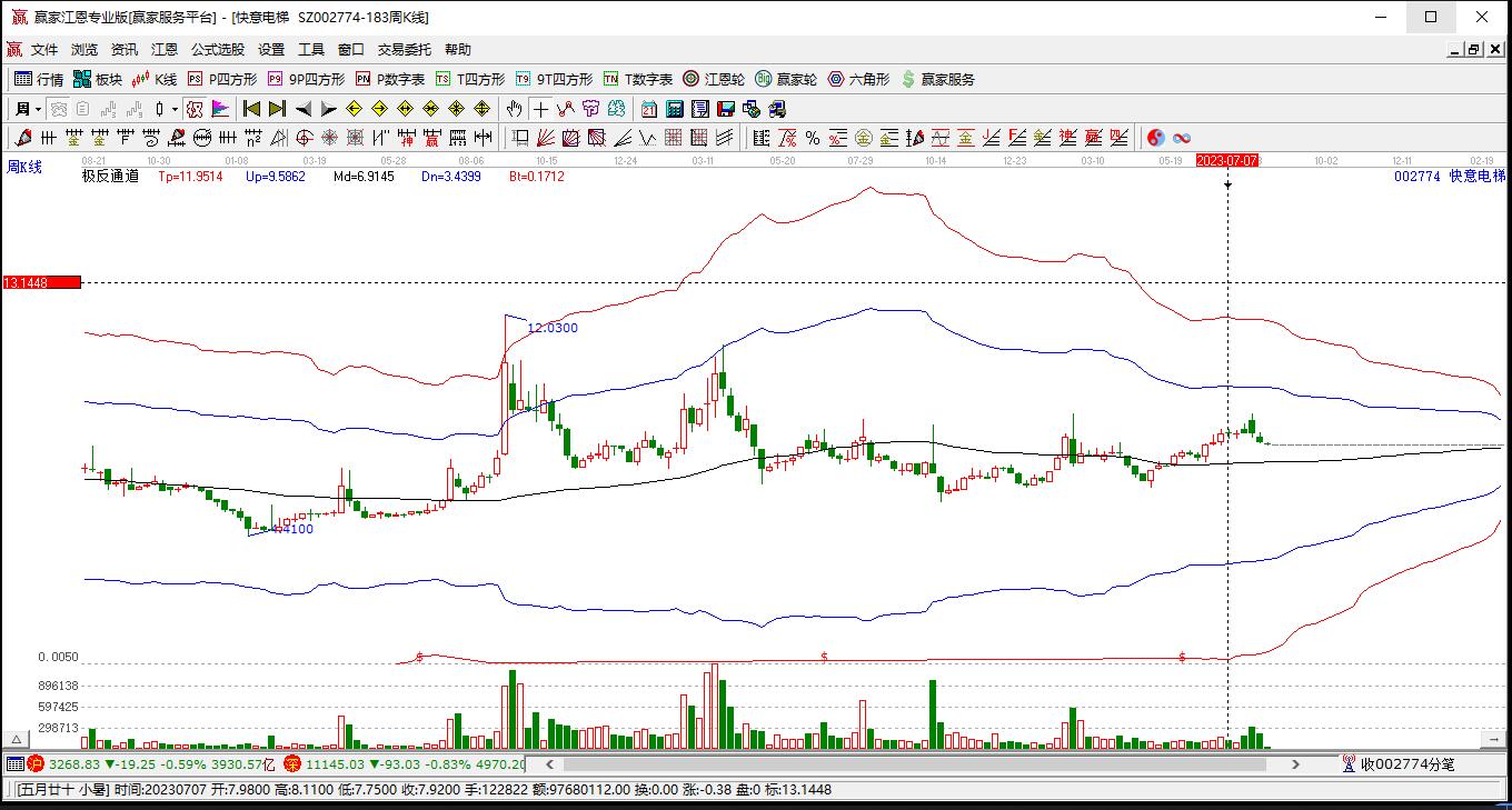 依據(jù)贏家江恩極反通道趨勢工具展示,本周股價(jià)處于生命線上強(qiáng)勢通道,本周收盤價(jià)11.25,自近期通道內(nèi)高點(diǎn)16.45持續(xù)下跌至本周,到達(dá)生命線9.3732點(diǎn)上方,短期關(guān)注此線支撐,如支撐不破,保持在強(qiáng)勢通道內(nèi),波段繼續(xù)看多,有望再次挑戰(zhàn)藍(lán)色上軌線。若跌破生命線9.3732,進(jìn)入弱勢通道,打開下跌空間。