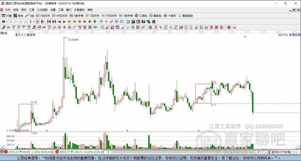 依據(jù)贏家江恩輪中輪價(jià)格模型工具展示,本周股價(jià)微跌1.57%,跌破贏家江恩輪中輪四方形關(guān)鍵位置11.37。依據(jù)贏家江恩輪中輪規(guī)則,市場中圓形、三角形、四方形是一切市場周期運(yùn)行的基礎(chǔ)。若不能快速收復(fù)四方形關(guān)鍵位置,則注意下方三角形關(guān)鍵支撐位11.01,若能再次站穩(wěn)四方形關(guān)鍵位置,則關(guān)注上方三角形壓力位12.45點(diǎn)。