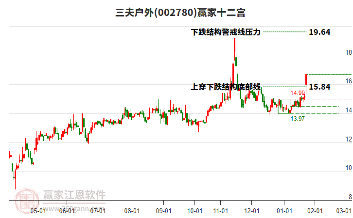 三夫戶外(002780)目前漲停,與所屬行業(yè)概念下股票形成聯(lián)動效應(yīng)。三夫戶外(002780)截止目前突破江恩價格循環(huán)線工具壓力位15.28元,根據(jù)贏家江恩江恩價格循環(huán)線工具展示,上方第一壓力位18.2