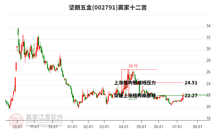 002791堅朗五金當(dāng)前,以收10cm漲停收盤,近15個交易日漲幅17.46%,今天K線上穿前方下跌結(jié)構(gòu)頂部紅色阻力線
