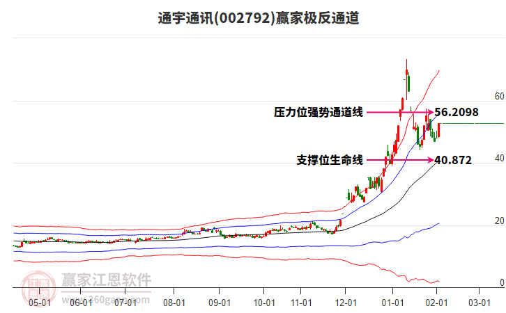 依據(jù)贏家江恩系統(tǒng)趨勢(shì)工具極反通道分析判斷通宇通訊002792運(yùn)行在生命線以下弱勢(shì)區(qū)域,根據(jù)規(guī)則該股短線輕倉參與,股價(jià)跌至弱勢(shì)外軌線后波段再結(jié)合其它工具信號(hào)建倉。應(yīng)用口訣是:生命線上強(qiáng)勢(shì)走,生命線下難抬頭;紅黃兩條外軌線,壓力支撐顯勢(shì)頭。