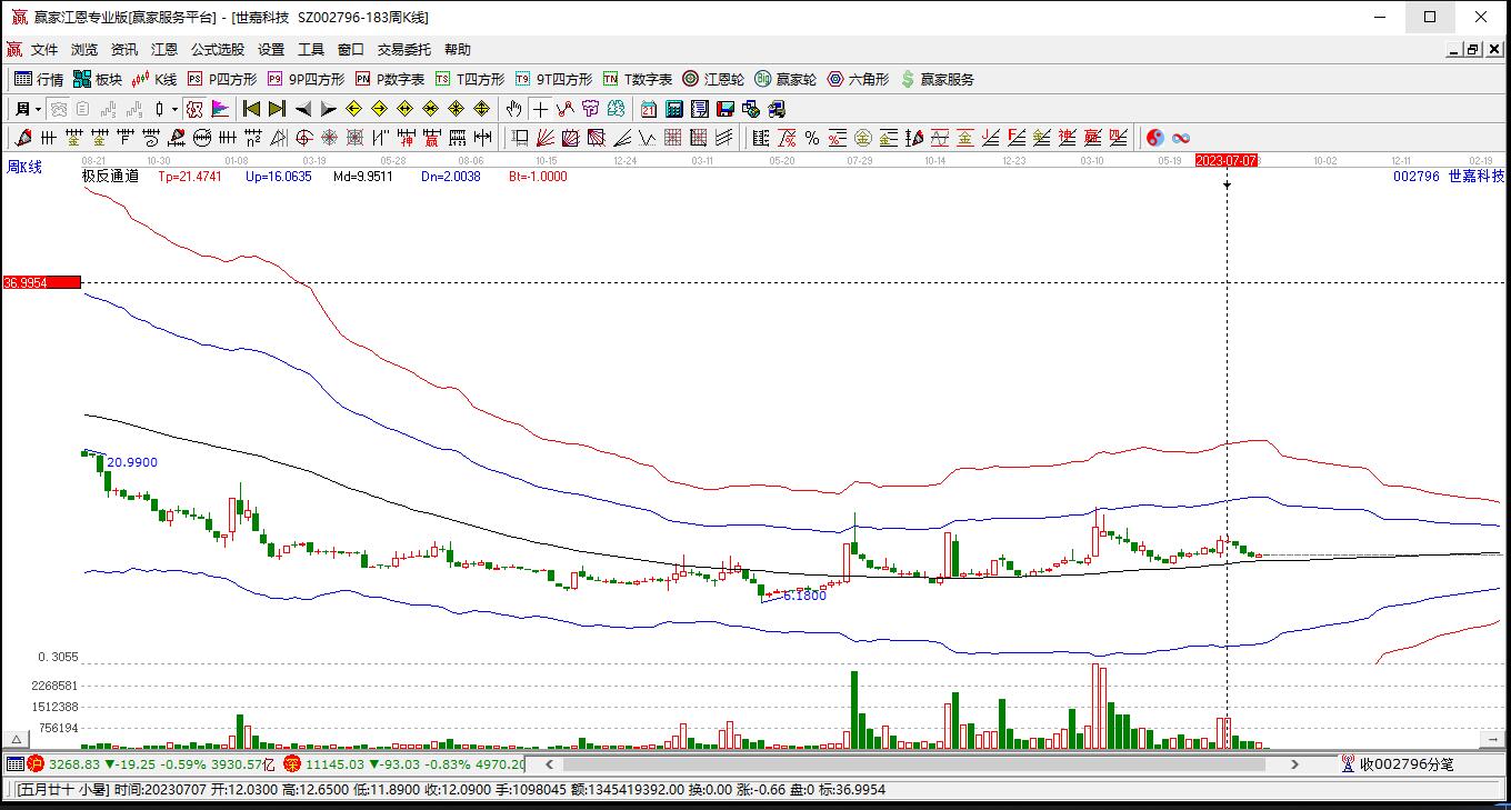 002796世嘉科技目前漲停,所屬板塊5G、儲能、一帶一路短期底分型后持續(xù)上攻。002796世嘉科技截止目前突破極反通道強(qiáng)勢通道線,根據(jù)贏家江恩極反通道趨勢工具展示,上方壓力位55.6551,下方支撐