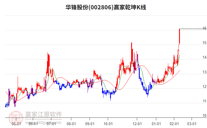 今日華鋒股份002806上穿藍(lán)色外軌線 以上影中陽線收盤