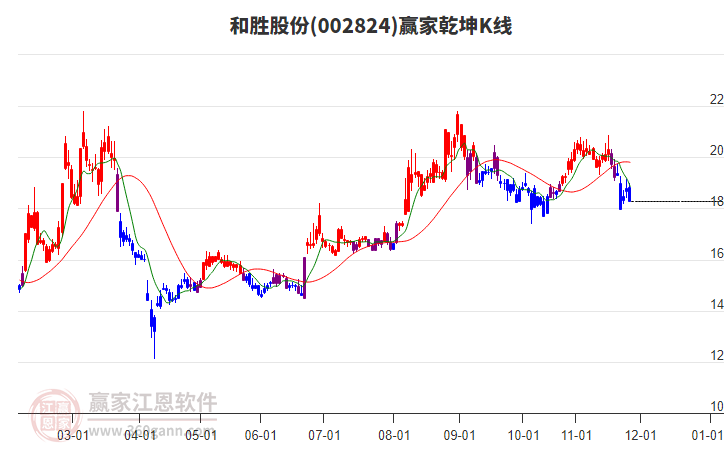 依據(jù)贏家江恩系統(tǒng)趨勢(shì)工具極反通道分析判斷和勝股份002824運(yùn)行在生命線以下弱勢(shì)區(qū)域,根據(jù)規(guī)則該股短線輕倉(cāng)參與,股價(jià)跌至弱勢(shì)外軌線后波段再結(jié)合其它工具信號(hào)建倉(cāng)。應(yīng)用口訣是:生命線上強(qiáng)勢(shì)走,生命線下難抬頭;紅黃兩條外軌線,壓力支撐顯勢(shì)頭。