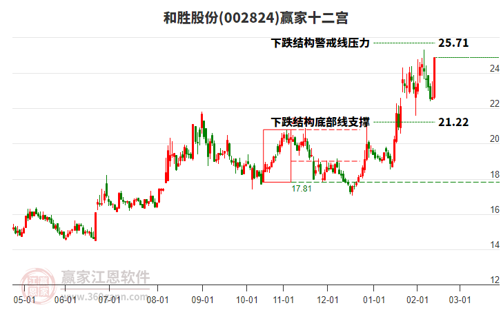 2月13日股價(jià)下穿前期2023年7月24日形成的下跌結(jié)構(gòu)頂部線,以穿頭破腳大陰線收盤,大幅下跌9.64%,近期高點(diǎn)為2月12日,跌至今日,持續(xù)1天,跌幅10.67%。依據(jù)贏家十二宮多空能量守恒規(guī)則,當(dāng)前股價(jià)下跌若不能收復(fù)下跌結(jié)構(gòu)頂部線22.63,多方能量持續(xù)萎縮,空方動(dòng)能充足,將會(huì)進(jìn)一步下探警戒線20.76,若能再次收復(fù)下跌結(jié)構(gòu)頂部線,有望再度展開上攻。