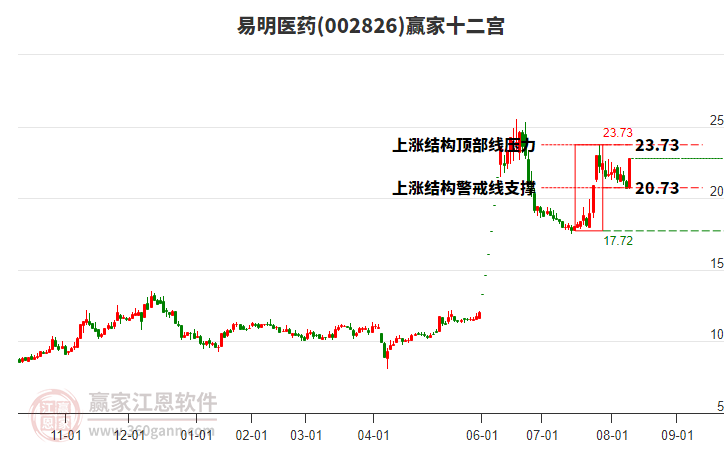依據(jù)贏家江恩系統(tǒng)趨勢工具極反通道分析判斷易明醫(yī)藥002826運(yùn)行在生命線以上強(qiáng)勢區(qū)域,根據(jù)規(guī)則該股可短線、波段結(jié)合操作;結(jié)合物極必反的原理通過分鐘圖做盤中差價,應(yīng)用口訣是:生命線上強(qiáng)勢走,生命線下難抬頭;紅黃兩條外軌線,壓力支撐顯勢頭。