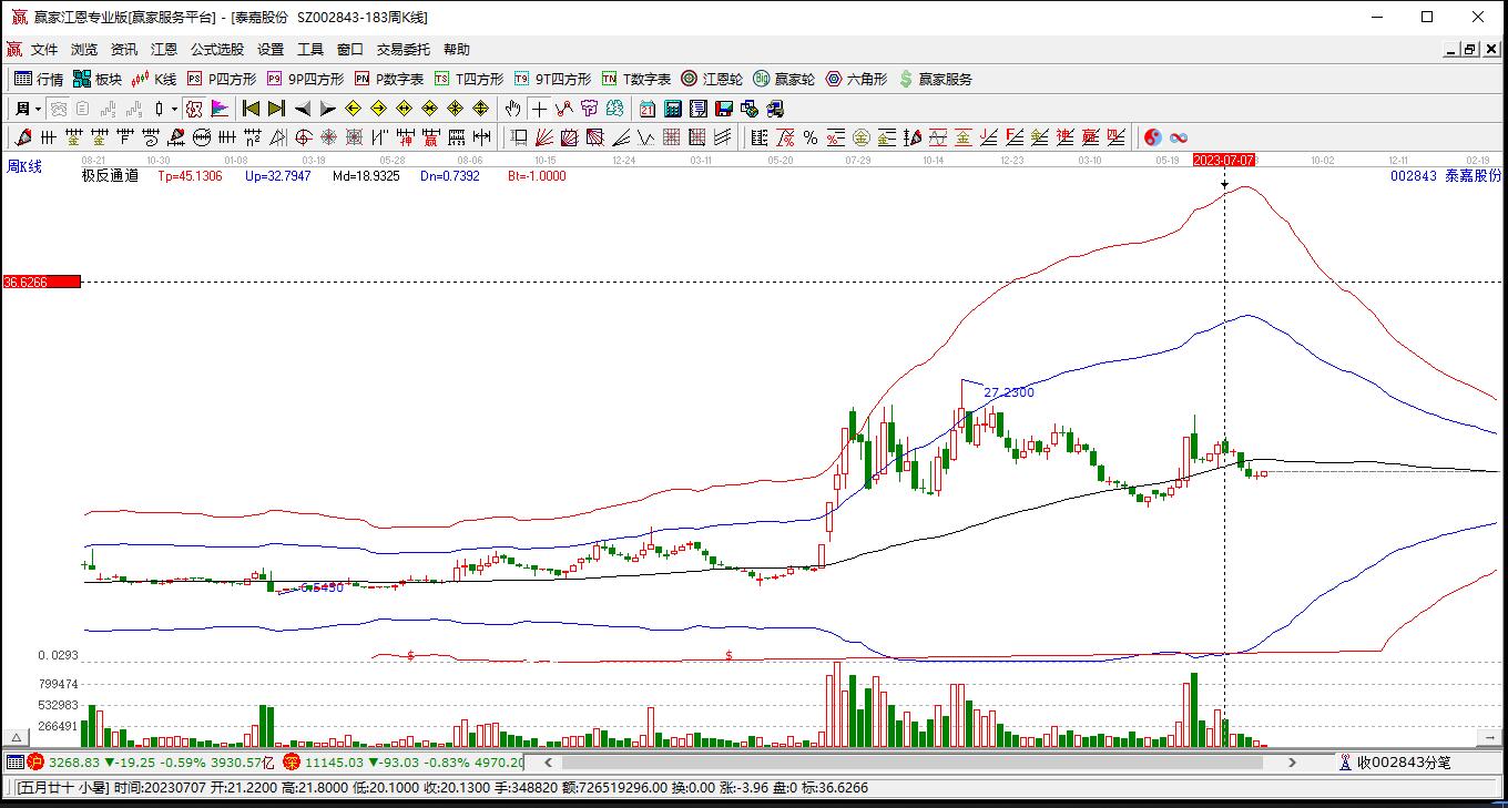 泰嘉股份處于贏家江恩多頭中期回調(diào)形態(tài),12月23日發(fā)出江恩筑底信號(hào)后,經(jīng)過(guò)35日,今日形成短期筑頂信號(hào),短期多頭趨勢(shì)已被破壞,中長(zhǎng)期多頭趨勢(shì)依舊保持。泰嘉股份根據(jù)贏家江恩極反通道趨勢(shì)工具展示,上方壓力