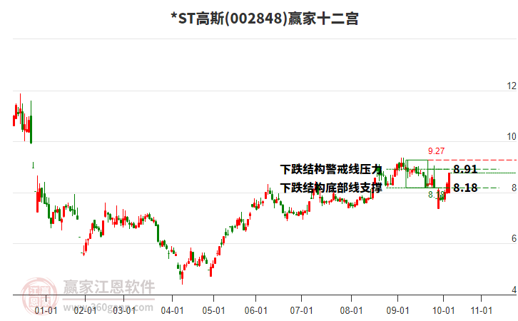 002848*ST高斯目前漲停,走出獨(dú)立行情。002848*ST高斯截止目前上穿江恩價(jià)格百分比工具關(guān)鍵點(diǎn)位11.04元,根據(jù)贏家江恩江恩價(jià)格百分比工具展示,上方第一壓力位11.65,第二壓力位11.9