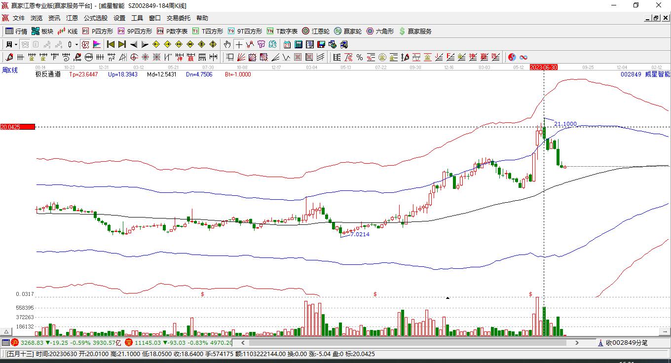 1月15日002849威星智能最高價(jià)19.08挑戰(zhàn)了贏家極反通道工具上方紅色外軌線,受到上方紅色外軌線強(qiáng)力壓制,最終收盤停留在在上方紅色外軌線與藍(lán)色外軌線上方的超強(qiáng)通道區(qū)域。002849威星智能近10