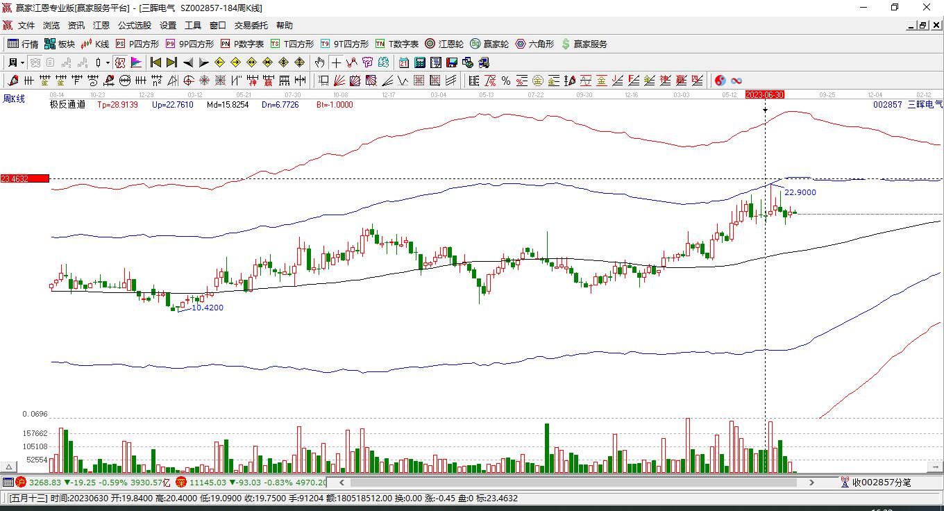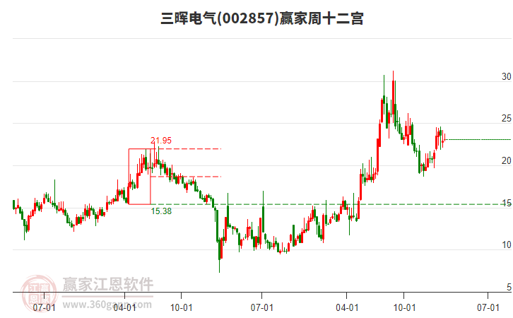 今日002857三暉電氣最高價24.28上穿了贏家極反通道工具藍色外軌線,受到藍色外軌線強力壓制,最終收盤停留在在藍色外軌線與生命線上方的強勢通道區(qū)域。002857三暉電氣近10個交易日漲幅14.56