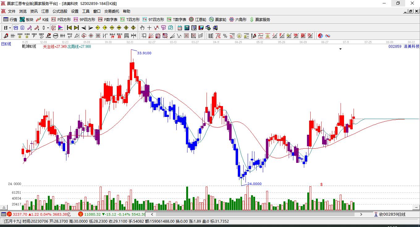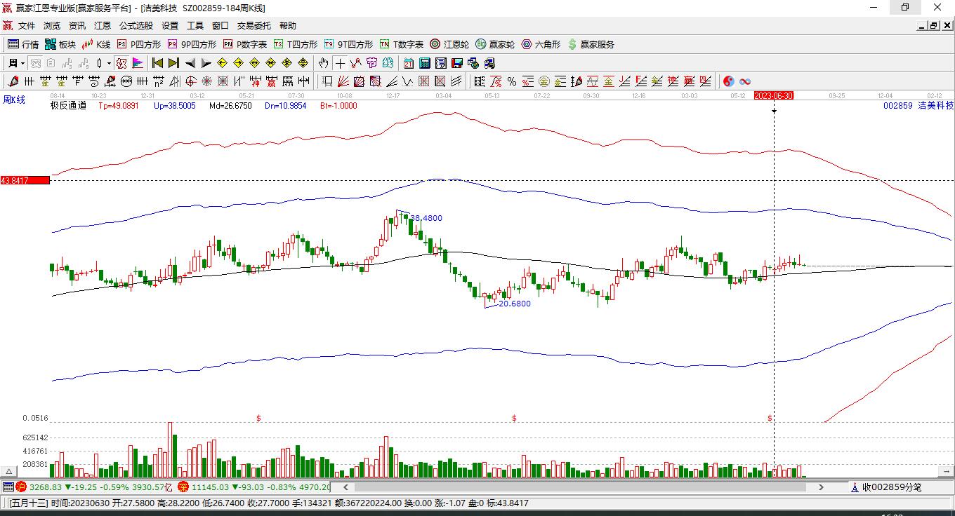 當天002859潔美科技最高價42.66挑戰(zhàn)了贏家極反通道工具上方紅色外軌線,受到上方紅色外軌線強力壓制,最終收盤停留在在上方紅色外軌線與藍色外軌線上方的超強通道區(qū)域。002859潔美科技近10個交易
