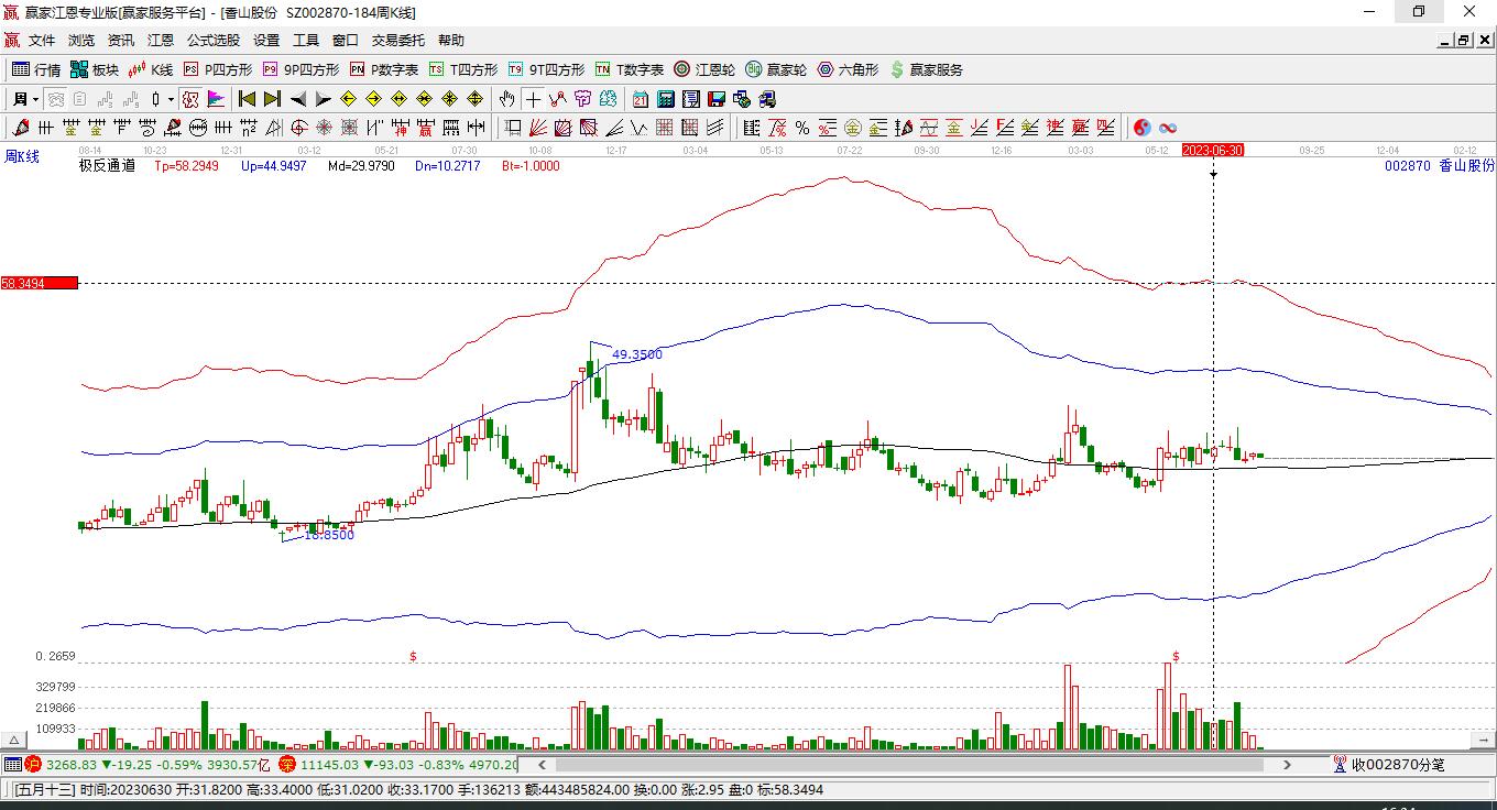 依據(jù)贏家江恩極反通道趨勢(shì)工具展示,本周股價(jià)處于生命線上強(qiáng)勢(shì)通道,本周收盤價(jià)39.82,自近期通道內(nèi)高點(diǎn)43.68持續(xù)下跌至本周,到達(dá)生命線35.1431點(diǎn)上方,短期關(guān)注此線支撐,如支撐不破,保持在強(qiáng)勢(shì)通道內(nèi),波段繼續(xù)看多,有望再次挑戰(zhàn)藍(lán)色上軌線。若跌破生命線35.1431,進(jìn)入弱勢(shì)通道,打開下跌空間。