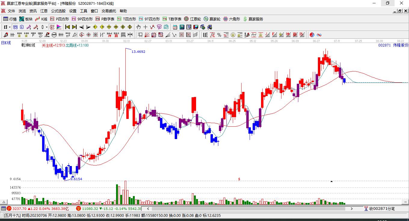 002871偉隆股份處于贏家江恩多頭主線形態(tài),今日重心上移,短期持續(xù)上漲,從11月21日形成中期底分型后,行情經(jīng)歷一波上漲,突破前高形成中期初次筑底信號,長期處于多頭回調(diào)趨勢。偉隆股份截至目前K線為上